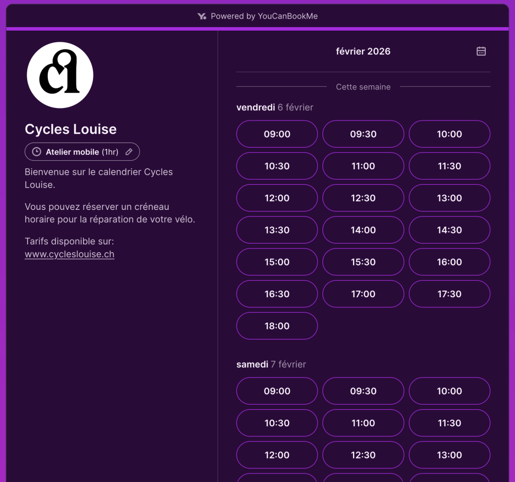 Afin de prendre rendez-vous pour vous et votre vélo il vous suffit de vous rendre sur la page « You Can Book.me » de Cycles Louise: